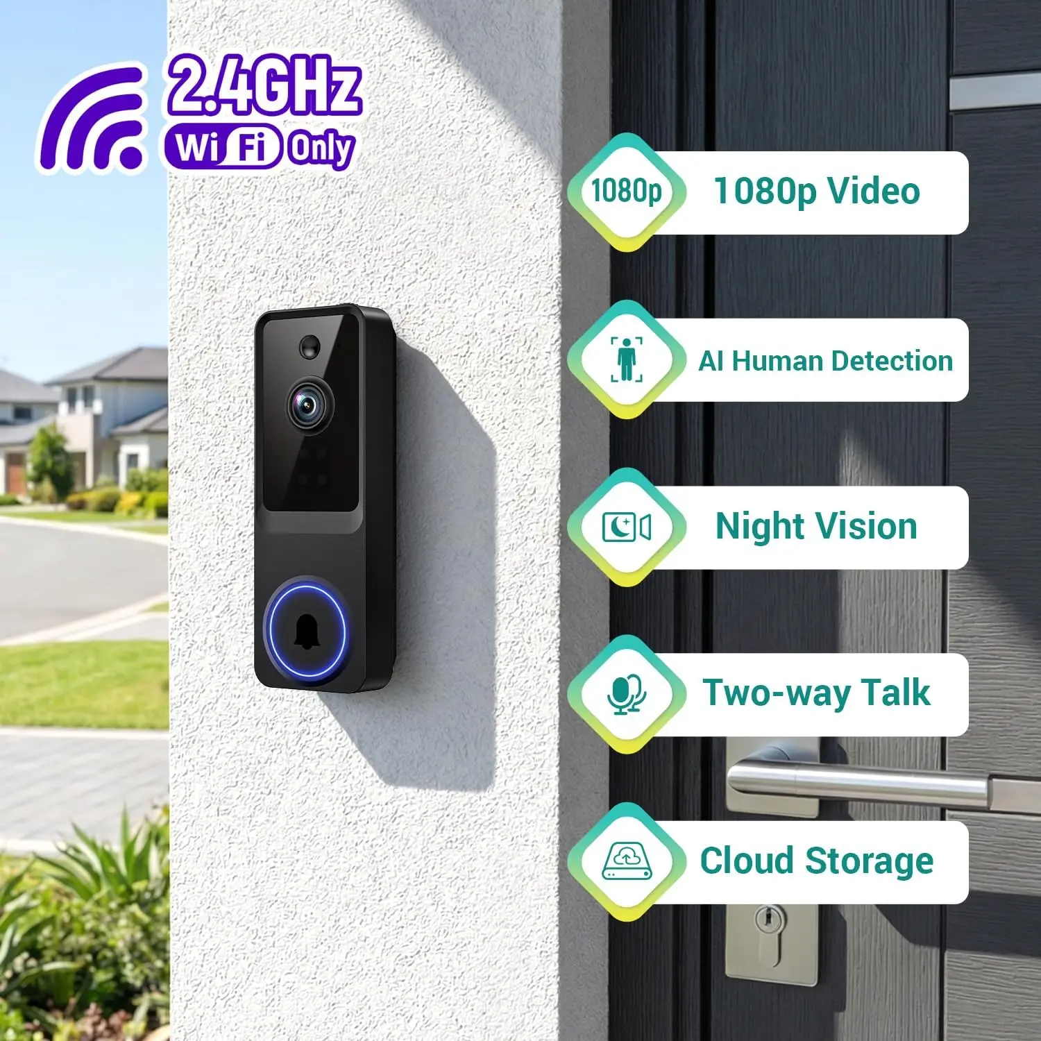 Enhance your home security with our advanced smart doorbell camera. Key features include: - 1080P HD Video: Enjoy crystal-clear video quality for detailed monitoring of your property. - AI Motion Detection: Intelligent sensors detect movement and send instant alerts to your smartphone, reducing false alarms. - Night Vision: Equipped with infrared LEDs for clear visibility in low-light conditions up to 30 feet. - Two-Way Talk: Communicate directly with visitors through the built-in speaker and microphone from anywhere. - Cloud Storage Option: Securely store recorded footage online for easy access and review (subscription may apply). - Indoor/Outdoor Versatility: Designed to withstand various weather conditions, suitable for both indoor and outdoor installation. - Battery Powered: Easy setup without wiring hassles; long-lasting battery life ensures continuous operation. - 2.4GHz Wi-Fi Connectivity: Connects seamlessly to your home network for remote access via a dedicated app on iOS or Android devices. This device is ideal for homeowners seeking reliable surveillance, offering peace of mind with its user-friendly interface and robust performance. Installation is straightforward—simply mount it at your entrance and connect via the app. Regular updates ensure optimal functionality. Note that cloud storage requires an optional subscription; local storage options are not included.