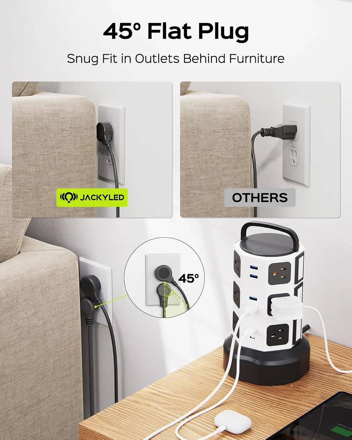 About This Product: ▶【Retractable Cord Design】: Features a 10ft pure copper retractable cord that can be easily rolled up by rotating the tower, keeping your workspace tidy and allowing adjustable cord length to suit your needs. The long cord provides flexibility for placement anywhere in your home or office. A durable handle on top ensures convenient portability. Safety Tip: Avoid using non-standard adapters or plugs to prevent short-circuits. ▶【Energy Efficiency】: Each layer includes an independent switch, enabling you to turn off unused outlets and save electricity. Designed to support a wide voltage range of 110V-240V, this surge protector adapts to different regions. Under 125V, maximum power is 1625W (125V x 13A); under 240V, it can reach up to 3000W. Do not exceed the total wattage for safe operation (Formula: P=UI, where P=Power, U=Voltage, I=Current). ▶【Space-Saving Vertical Tower】: The vertical tower design minimizes footprint on desks or nightstands, preventing large plugs from blocking adjacent outlets and optimizing space in compact areas like offices or bedrooms. ▶【Smart USB Charging】: Equipped with 6 USB ports offering a shared output of 4.8A and a maximum of 2.4A per port, allowing simultaneous fast charging of multiple devices such as smartphones, tablets, MP3 players, and digital cameras. ▶【Safety and Reliability】: Certified by RoHS and FCC standards, this power strip includes comprehensive protection features: surge protection (1050J), overload protection, short-circuit protection, over-current protection, over-voltage protection, and overheat protection. It automatically cuts off power during overwhelming voltage surges to safeguard connected devices. ▶【Versatile Use】: Ideal for various settings including home offices, computer setups, nightstands for bedside charging, and general household use. Its heavy-duty extension cord supports high-power appliances while maintaining safety. ▶【Durability and Convenience】: Constructed with robust materials for long-lasting performance. The retractable mechanism reduces cord clutter, enhancing organization and ease of storage when not in use. This product combines functionality with safety features to provide a reliable charging solution for modern electronic needs.