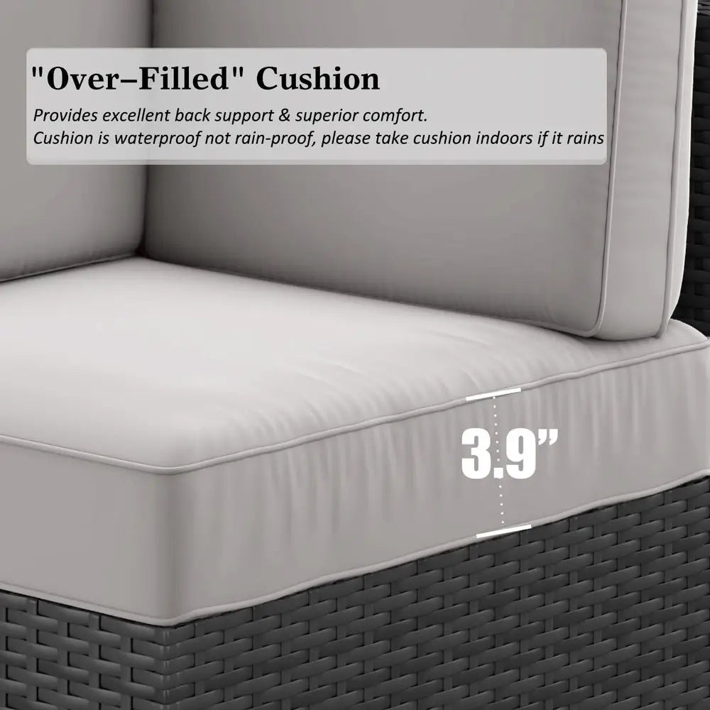 <>Color> Light Grey <>Size> 15 Piece Set <>Style> Natural or Tropical <>Assembly Required> Yes Crafted from high-quality PE rattan wicker and steel frame, this outdoor furniture set offers excellent support and durability. The woven PE rattan is strong, long-lasting, lightweight, and water-resistant, making it suitable for all weather conditions. PROVIDES ULTRA COMFORT: Our cushions are made of 100% polyester fabric, water repellent, and durable. Filled with premium 3.9-pound foam to stay plush and non-deforming, ensuring you won't get tired while sitting. 55,000 BTU FIRE PIT TABLE: Equipped with a dual-tube stainless steel burner, the heat output is 55,000 BTUs upon ignition, which keeps the fire stable and fully burned, providing sufficient warmth. Propane fuel allows you to no longer suffer from ash and smoke. HUMANIZED DESIGN: Long back cushions with straps can keep the cushions in place tightly. The fire pit provides plenty of warmth, and the coffee and side tables are large enough to hold your drinks, snacks, small items, etc. FLEXIBLE COMBINATION SETTING: The 15-piece outdoor furniture set includes 4 x Sofas, 8 x Single Sofas, 1 x Fire Pit Table, and 2 x Coffee Tables. It allows for versatile arrangement to suit your needs and match your space.