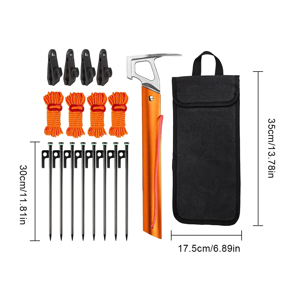 Material: forged steel (floor nail), aluminum alloy (floor nail hammer), nylon (umbrella rope), ABS (tent clip), thick canvas (ground nails bag)