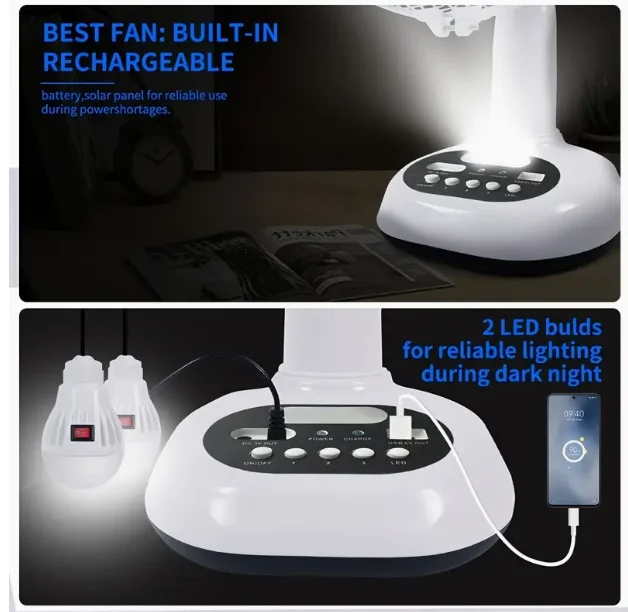 1pcs 12 inch 14400mAh battery capacity portable solar charging fan with 2 bulbs with LED lighting and USB phone charging