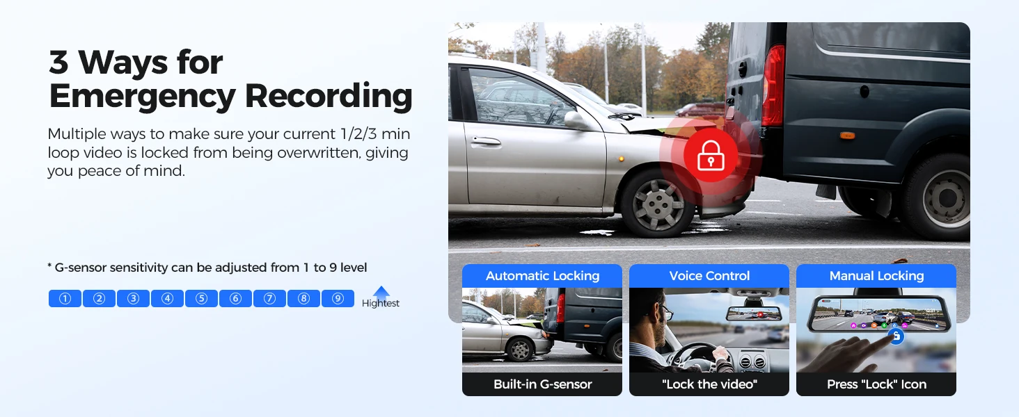 Built-in time-lapse parking mode (requires hardwire kit*) monitors your vehicle 24/7 while saving storage space. Loop recording auto-overwrites old footage but locks critical events like collisions.