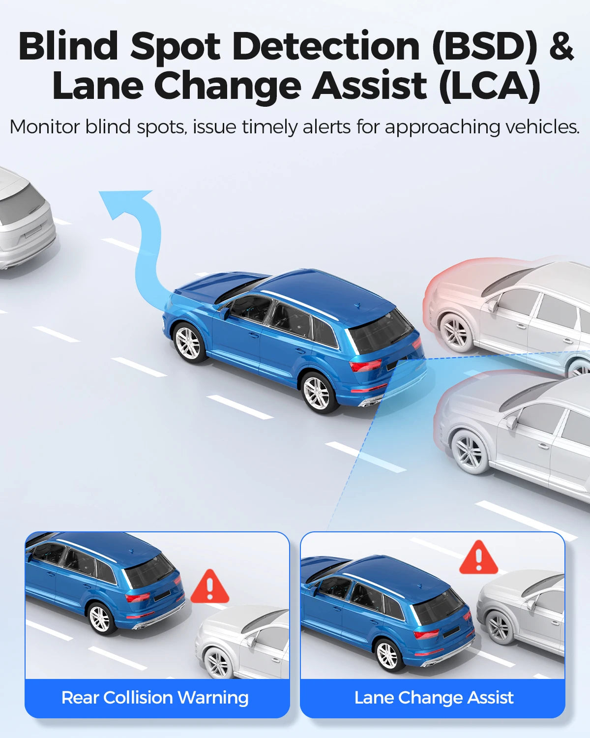 Enhanced driving safety with BSD (Blind Spot Detection) and LCA (Lane Change Assist) alerts, plus collision warnings and lane departure notifications to reduce risks on the road.