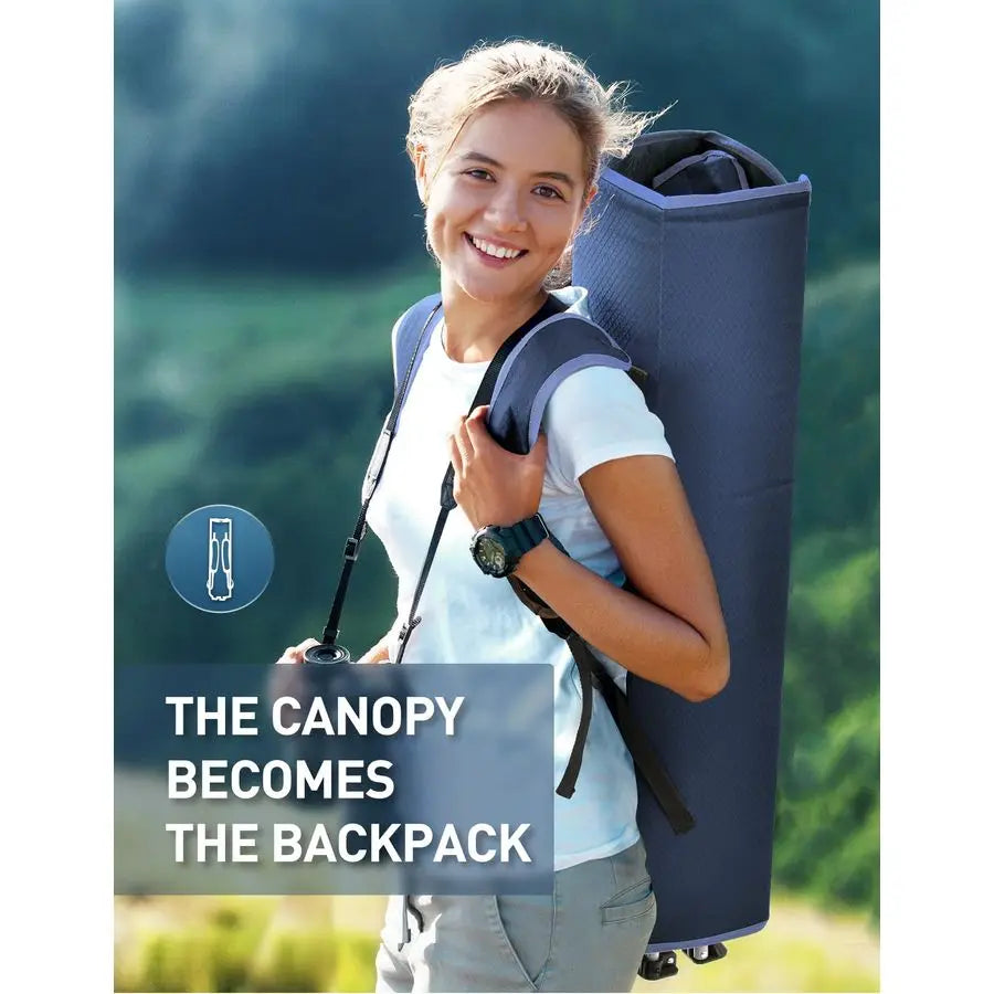 EASY TO CARRY The canopy becomes a carry case when folded secured by two durable snaplock buckles, and the comfortable padded shoulder straps make the folding chair with canopy as easy to carry as a backpack no more bags to deal with