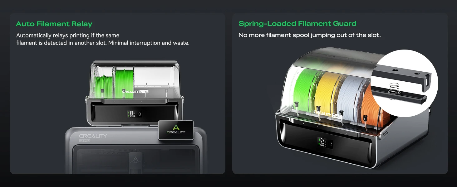 Creality K2 Pro Combo 3d printer works seamlessly with the CFS Smart Filament System, enabling up to 16-color and multi-material printing. Auto filament identification, intelligent feeding, and moisture-proof storage provide a hassle-free, worry-free printing experience.