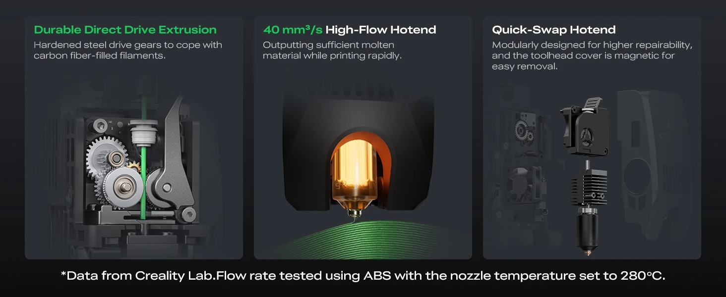 Built for speed and durability,hardened steel gears of this extruder handle abrasive filaments like carbon fiber. Achieve 40mm³/s flow for fast, clog-free printing. Integrated sensor enables automatic filament cutting. Features a quick-swap hotend for easy maintenance. Ideal for high-speed, professional results.