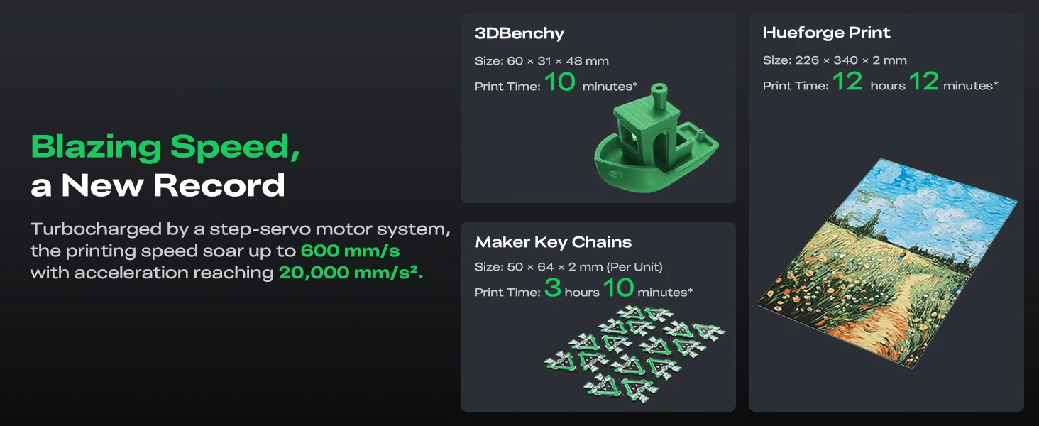 Chamber AI Camera enables 24 hours monitoring, including print failure detection, build plate check and time-lapse filming, while Nozzle AI Camera auto-tunes flow rate in real-time, with pressure advance tuning, flow rate optimization and waste chute blockage detection.