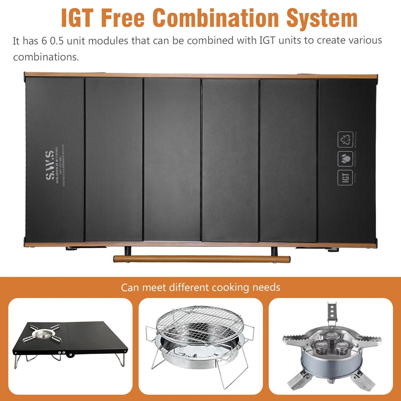Features: 1.IGT Free Combination System: This folding IGT camping table features six 0.5-unit modules, enabling creative layouts to meet various cooking needs. Compatible with most market-available portable grills or stoves for true outdoor versatility. 2.Easy Folding Design: With a user-friendly frame, this portable camping table sets up in seconds. Its compact packed size of 32.28"L x 8.27"W x 5.91"H ensures effortless transport and storage for all your camping adventures. 3.Thoughtful Details: Designed with a handy hanging pole for utensils and cookware, this IGT unit combination table also has adjustable folding legs. It easily adapts to uneven terrains for stable use in any environment. 4.Ultra-Light Aluminum Material: Built from sturdy 6063 aluminum alloy, this ultralight aluminum camp table weighs just 6.7 lbs yet supports up to 220 lbs. Enjoy lasting reliability and stability wherever your journeys take you. 5.Versatile Application: Ideal for home and outdoor use, this folding square table excels at car camping, tailgating, BBQs, RV trips, patios, beaches, and more. Open dimensions Specification: