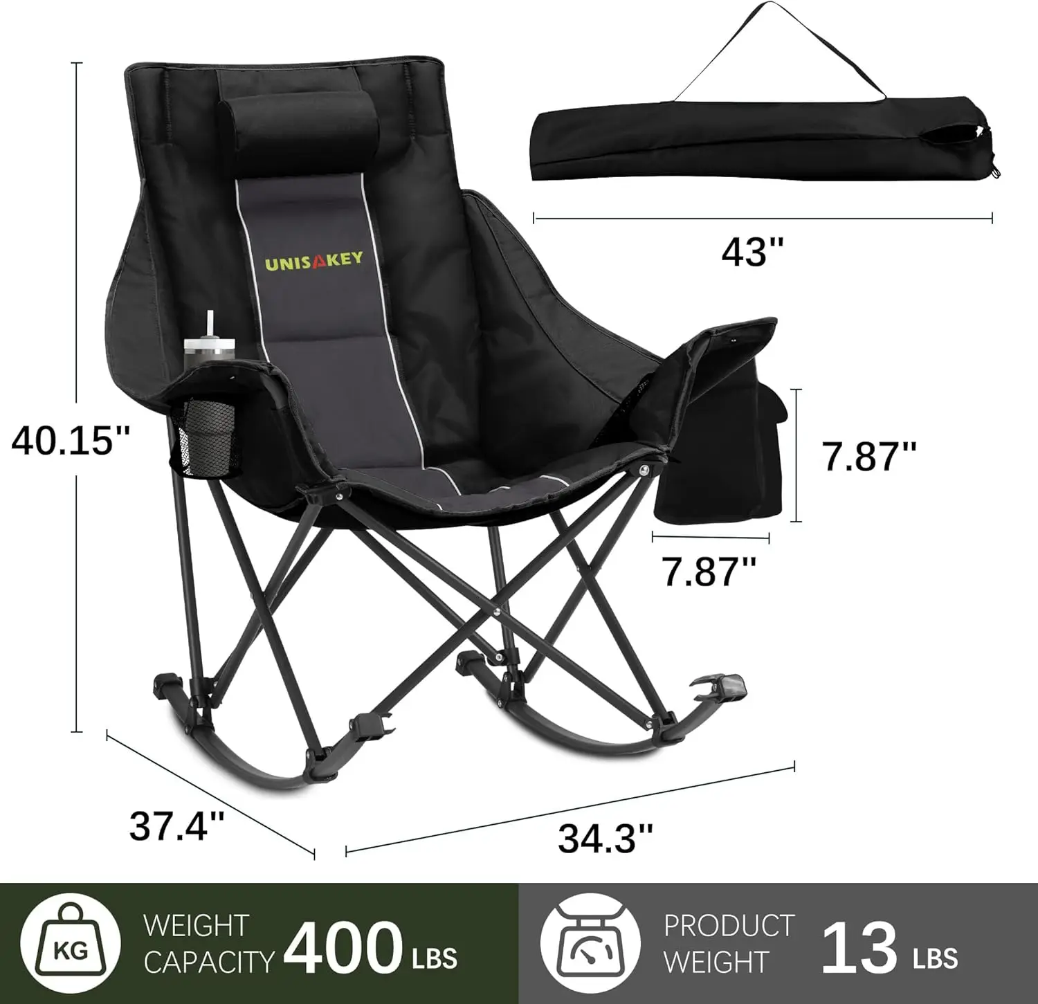 Oversized Rocking Camping Chair with Headrest & Cup Holder, 400lbs Capacity, Easy Fold Portable for Outdoor