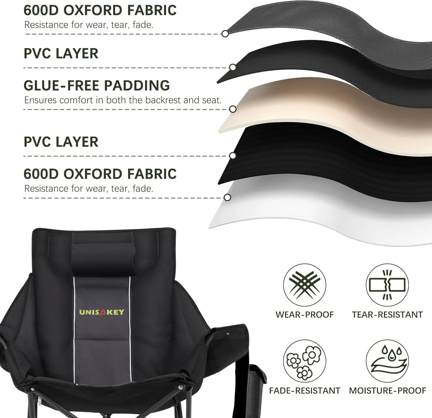 【Instant Rocking Comfort】Experience effortless relaxation with this rocking camping chair—unfolds in seconds without any assembly required. Ideal for quick setup at campsites, beach outings, or backyard gatherings after a long day. 【Premium Comfort & Convenience】Stay organized and comfortable outdoors with built-in features: a cup holder for drinks, side pockets for phones and snacks, and a padded headrest for added support. Everything you need is within easy reach. 【Heavy-Duty Construction】Built to last on rugged terrain, this outdoor rocking chair features curved non-slip legs and a reinforced steel frame that supports up to 400 pounds. It remains steady on grass, sand, or rocky trails. 【Weatherproof Fabric】Made from water-resistant 600D Oxford fabric that wipes clean quickly. No worries about spills, mud, or sudden rain during outdoor events like concerts or picnics. 【Lightweight & Portable】Weighing under 13 pounds with a compact folding design and included carry bag. Easily transport it in your car trunk or carry hands-free to RV trips, sports games, or stargazing sessions. 【Versatile Use】Perfect for various outdoor activities including camping, hiking, fishing, tailgating parties, garden lounging, and more. Enhances your comfort wherever you go. 【Easy Maintenance】The durable fabric requires minimal upkeep—simply wipe down as needed to keep it looking fresh after every adventure. 【Safety Features】Designed with stability in mind to prevent tipping on uneven surfaces. Enjoy peace of mind while relaxing outdoors.