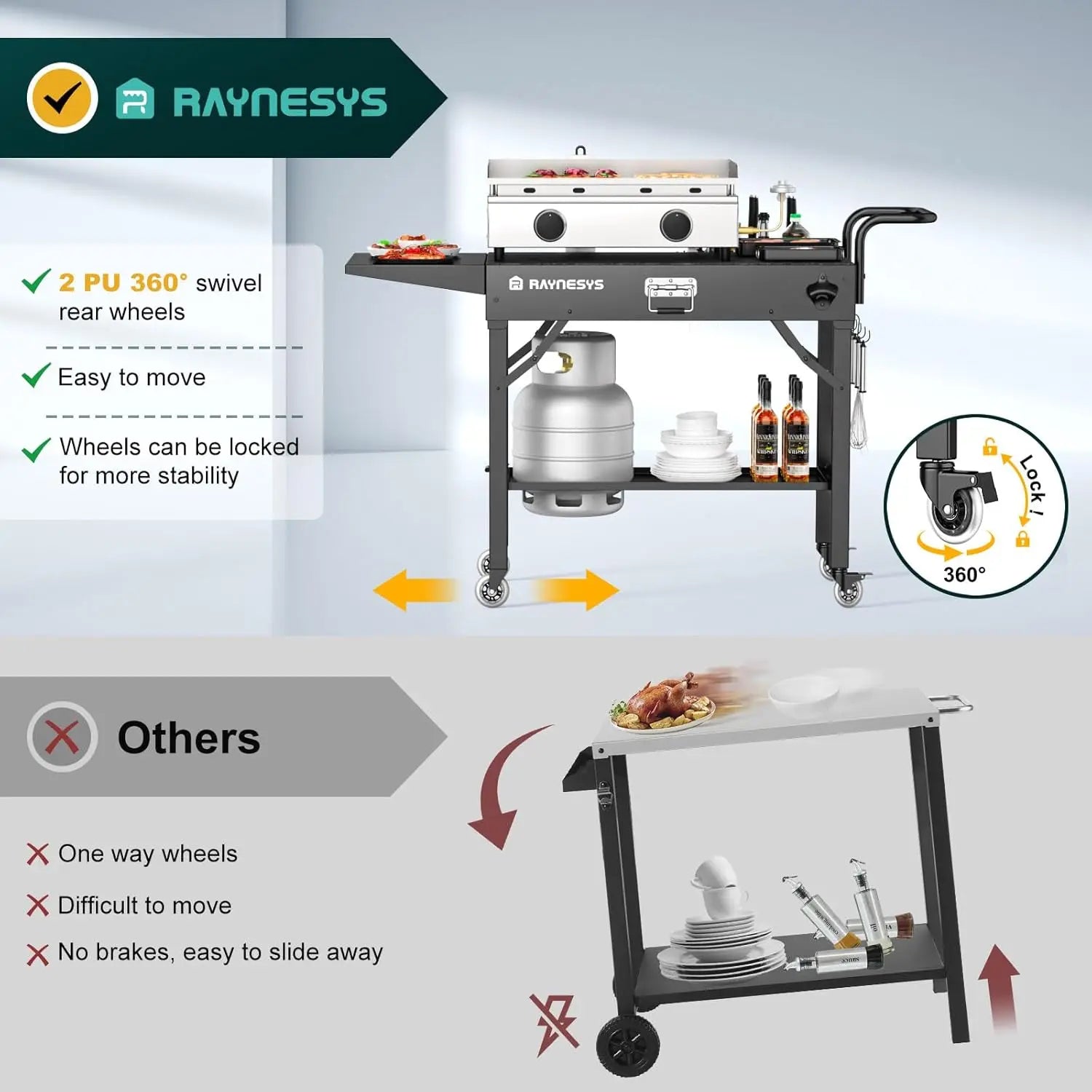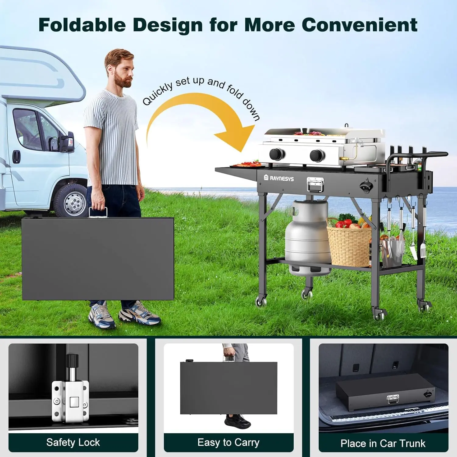 Enhance your outdoor cooking experience with our versatile and sturdy portable grill cart. Designed for convenience and durability, this table is perfect for various activities like camping, tailgating, picnics, and RV trips. Key features include: 1. Universal Compatibility: This folding grill table fits equipment up to 31 inches wide by 17 inches deep, making it an ideal partner for griddles, pizza ovens, tabletop grills, propane stoves, and other portable outdoor cooking gear. Its adaptable design ensures it works seamlessly with most standard-sized appliances. 2. High Load-Bearing Capacity: Built with a reinforced triangular structure for enhanced stability, this cart can easily support up to 440 pounds. It keeps your cooking equipment steady during use, providing a safe and reliable platform. The lower shelf includes a circular opening designed to securely hold a gas canister, eliminating the need for wall-mounted cylinders and reducing fall hazards. 3. Extended Workspace: Featuring an extended countertop design, this grill cart offers ample space to store ingredients and cookware efficiently. Additional storage options include a hanging tissue holder and side-mounted box for condiment jars and BBQ tools, helping you stay organized while cooking outdoors. 4. Foldable Portability: With a simple suitcase-like operation, this table can be quickly folded or unfolded for easy transport. When folded compactly, it fits conveniently in car trunks without taking up much space—perfect for on-the-go adventures where you want to enjoy delicious meals without hassle. 5. Multi-Functional Mobility: Equipped with 3-inch silent universal wheels and a curved handle, this cart moves smoothly in any direction with minimal effort. It serves as a versatile solution not only as an outdoor barbecue or camping table but also indoors as a mobile workbench or storage rack. Rear wheels feature brakes to secure the cart in place when needed. This durable grill cart combines practicality with ease of use to make your outdoor gatherings more enjoyable.