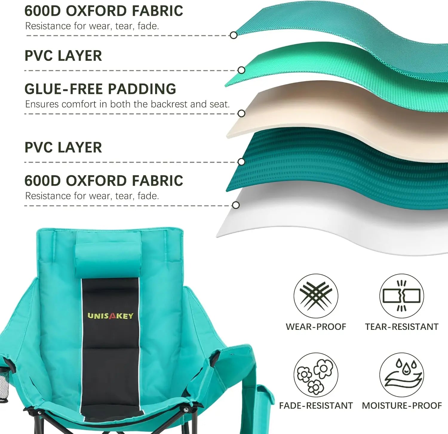 Experience ultimate relaxation with our portable rocking camping chair. Designed for outdoor enthusiasts, this chair combines comfort and convenience in one lightweight package. **Key Features:** - **Instant Setup & Comfort:** Unfolds in seconds with no assembly required. The seat sits at a comfortable 11.81 inches from the ground, making it easy to sit and stand without strain. Perfect for quick setup at campsites, beach outings, or backyard gatherings. - **Premium Convenience:** Stay organized while relaxing outdoors with built-in cup holder, side pockets for essentials like phones and snacks, and a padded headrest for added neck support. - **Durable Construction:** Built to withstand rugged use with curved non-slip legs and a reinforced steel frame that supports up to 400lbs. Remains steady on various surfaces including grass, sand, or rocky trails. - **Weather-Resistant Fabric:** Made from water-resistant 600D Oxford fabric that wipes clean easily—ideal for handling spills, mud, or unexpected rain during outdoor events like concerts or picnics. - **Lightweight & Portable:** Weighs under 13 lbs and features a compact folding design with an included carry bag. Easily fits in car trunks or can be carried hands-free to RV trips, sports games, or stargazing sessions. **Why Choose This Chair?** This rocking camping chair offers a perfect blend of durability and comfort. Its sturdy frame ensures stability on uneven terrain while the weatherproof fabric provides peace of mind during messy outdoor activities. The thoughtful design includes practical storage options so you can keep your essentials close at hand without interrupting your relaxation time. **Versatile Use Cases:** Ideal for camping trips where space is limited but comfort is essential; beach days when you want to relax by the water; backyard barbecues where extra seating is needed; hiking excursions requiring portable rest spots; sporting events where traditional chairs may not provide enough support; RV travels maximizing storage efficiency without sacrificing luxury seating options.